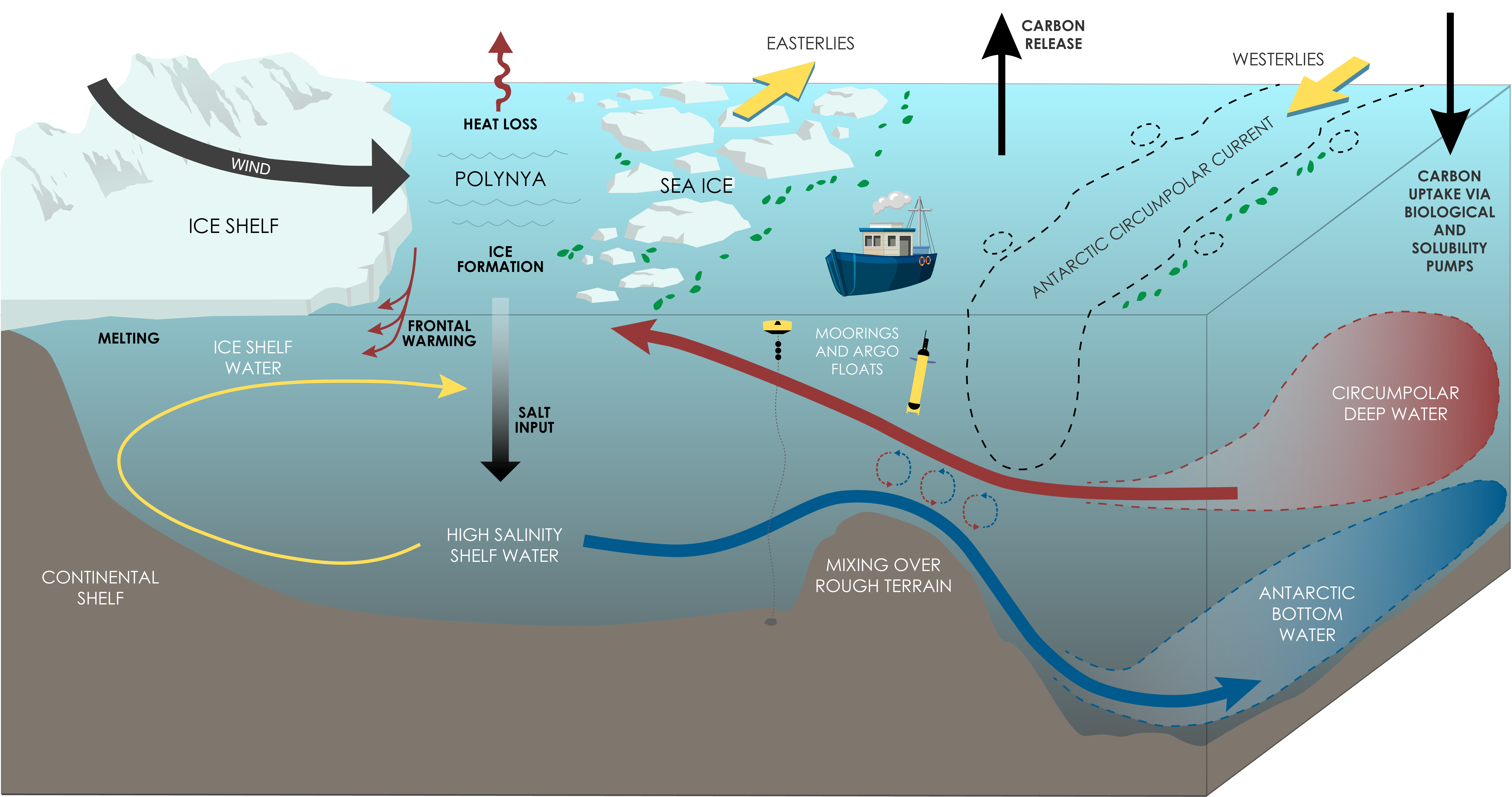 Bennetts et al. (2024). Closing the loops on Southern Ocean dynamics: from the circumpolar current to ice shelves and from bottom mixing to surface waves. Reviews of Geophysics 62(3): 1–80. https://doi.org/10.1029/2022RG000781
